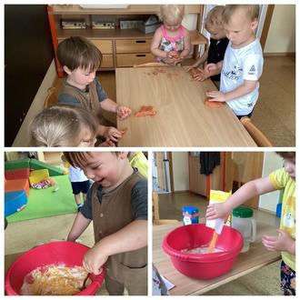Unsere Krippenkinder, die Marienkäferl, waren neulich ganz fleißig. Sie stellten mit Begeisterung ihre eigene Knete her. Nach dem Zusammenrühren konnten sie ihrer Fantasie freien Lauf lassen und kneten, matschen und formen. Ganz nebenbei wurde dabei ihre Feinmotorik und Kraft trainiert. Es entstanden die ersten tollen Kunstwerke. Wer auch Lust auf selbstgemachte Knete hat, findet unten das Rezept dazu.