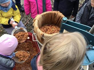 Ende Oktober hat sich im Kinderland Eicherloh – Am Park alles um den Apfel gedreht. Viele tolle Aktionen wie Apfelmassage, Apfelyoga, Apfelbastelarbeiten bis hin zum Pflanzen von Apfelkernen standen für die Kinder auf dem Programm. Am Dienstag der Apfelwoche haben die Kindergartenkinder einen gemeinsamen Ausflug zur Familie Faschinger unternommen. Voll bepackt mit einigen Kisten Äpfeln, ging es gleich nach dem Frühstück zur Apfelpresse. Voller Tatendrang wurden die Äpfel gewaschen. Anschließend wurden die ganzen Äpfel in einer Maschine zerkleinert, dabei konnten die Kinder immer wieder Äpfel selbständig hinein werfen. Mit Hilfe eines Sieb wurde die Apfelpresse von den Kindern befüllt. Anschließend wurde fleißig gepumpt, damit der Apfelsaft ausgepresst wird. Natürlich konnte dieser gleich probiert werden. Zuckersüß und total lecker! Die meisten Kinder konnten gar nicht genug bekommen von dem leckeren Saft. Den abgekochten Saft gab es am Donnerstag für die Kinder beim Apfelfest zum Trinken. Neben einem leckeren Buffet gab es für die Kinder viele tolle Spielstationen zum Thema Apfel. Am Freitag konnten die Kinder verschiedene Äpfel probieren, die von Kinderhauskindern mitgebracht wurden, welche einen eigenen Apfelbaum im Garten haben. Von süß, süß-sauer bis sauer gab es verschiedenste Apfelsorten zum Verspeisen. Aus den Resten wurden noch leckere Apfelwaffeln gebacken.