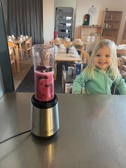 Um die Gesundheit unserer Kinder zu unterstützen und zu fördern haben wir einen Smoothie-Maker angeschafft. Der Smoothie-Maker sorgt für eine angenehmere Konsistenz als ein normaler Standmixer und ist auch für faserreiche Zutaten geeignet. Gemeinsam mit einigen Krippenkindern haben wir uns auf dem Weg zum ortsansässigen Netto gemacht. Dort inspizierten wir die Obst- und Gemüsetheke auf der Suche nach geeigneten Früchten für einen gesunden und leckeren Smoothie. Neben klassischen Früchten wie Äpfeln, Birnen, Bananen, Mandarinen oder Kiwis, kauften wir auch Rote Beete und Ingwer. Zurück im Kindergarten machten sich die Kinder fleißig ans Schälen und Kleinschneiden der verschiedenen Zutaten. Ganz gespannt beobachteten wir, wie die Früchte im Inneren des Smoothie-Makers langsam zu einer trinkbaren Konsistenz wurden. Das Ergebnis war ausgesprochen schmackhaft und wurde mit Begeisterung von den Kindern getrunken.