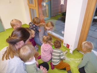 Wir haben nicht nur Wichtelbesuch bekommen, sondern auch der Nikolaus fand am 6. Dezember den Weg zu uns. Die Kinder hatten große Augen, als er plötzlich vor ihnen stand. Sie erkannten ihn an seinem roten Mantel, der Mitra auf dem Kopf, dem Rauschebart im Gesicht und dem goldenen Stab in der Hand. Er hatte auch einen großen Sack dabei und für jedes Kind etwas mitgebracht. Wir sangen „Guter alter Nikolaus“ und die Kinder begleiteten das Lied mit Orffinstrumenten. Das war ein aufregendes Erlebnis. Die ersten Flocken fanden in den letzten Tagen den Weg auf die Erde, ganz zur Freude der Kinder. Einige der Kleinen erleben den Winter und den Schnee zum ersten Mal ganz bewusst. Sie spüren, dass es draußen kälter geworden ist und sehen, dass alles weiß bedeckt ist. Die „staade Zeit“ lädt zum Zusammenkommen ein. Und so luden wir am Dienstag, den 20.12. zum Eltern-Kind-Adventsnachmittag ein. Ein gemeinsamer Sitzkreis leitete das Ankommen ein. In die Kreismitte legten wir einen großen Kranz aus Tannenzweigen. Mit Glitzersternen, Zapfen und Christbaumkugeln wurde er dann verziert. Im Anschluss sangen wir „Am Kranz brennt a Kerzerl“. Es gab einen Waffelstand, Lebkuchen, Punsch und Kaffee für die Mamas und Papas. Die Kinder hatten Verschiedenes gebastelt, das die Eltern dann erwerben konnten. Der Basar bietet Sternenanhänger, selbstgemachte Apfelmarmelade und Teelichtgläser. Das Jahr beendeten wir am Freitag, den 23.12. mit einer Kinder-Weihnachtsfeier.