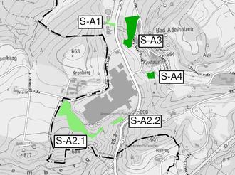 Die bestehenden Ausgleichsflächen zum Bebauungsplan „Sondergebiet Mineralwasser- und Brunnenbetrieb Bad Adelholzen“ im Gemeindegebiet Siegsdorf liegen südlich und westlich des Hochregallagers des Werkes, nördlich der Werks-Kläranlage im Übergang zu den Schönungsteichen und nordöstlich der Ortschaft Oberscharam (Habachfeld) in Eisenärzt.