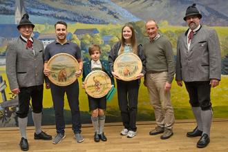Glückwünsche von den Organisatoren für die besten Hobbyschützen (von links): 1. Schützenmeister Peter Öri, Dorfkönig Matthias Schöberl, Dorflichtgewehrkönig Ludwig Holzner, Dorfjugendkönigin Elena Steiner, 1. Bürgermeister Thomas Kamm und 2. Schützenmeister Christian Fischer