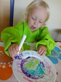 Beide Gruppen begleitete im Mai das Thema Mutter- und Vatertag. Wie im letzten Bericht schon beschrieben, wurden Karten mit gepressten Gartenblumen gestaltet. Die Kobolde haben ihre Karten mit Wasserfarben und Wachsmalkreiden bemalt. Ebenso durfte jedes Kind einen Frühstücksteller mit Porzellanfarbe und einer Herzschablone nach „Herzenslust“ bemalen und diesen dann den Mamas und/oder Papas beim Abholen überreichen.