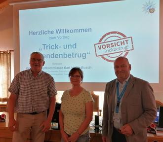 Kriminalhauptkommissar Karl-Heinz Busch erläuterte an tatsächlichen Beispielen, wie die „Kratler“, so bezeichnete er die Betrüger und Einbrecher, die ohne Skrupel und mit viel krimineller Energie einfachen Leuten das Geld aus der Tasche ziehen bzw. in die Wohnung eindringen, das Vorgehen dieser oft im Ausland sitzenden Banden.
