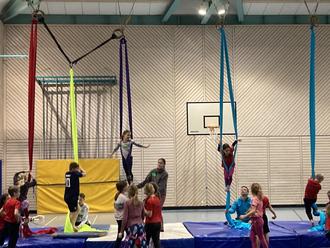 Um 14.00 Uhr war es dann für die Turnverein-Kids von der 2. - 4. Klasse soweit. Zuerst mussten sich die 20 Kinder durch spielerische Übungen aufwärmen und dehnen. Dann lernten Sie am Vertikaltuch und Trapez verschiedene Klettertechniken, elegante Figuren und gewagte Abfaller. Diese hatten zum Teil sehr lustige Namen wie das „springende Reh“, „die fliegende Oma“ oder „die Frau / der Mann im Mond“. Die Luftakrobatik erfordert Beweglichkeit, Kraft und Koordination und beansprucht jeden Muskel im Körper, was die Kinder am Ende des Workshops - nach 5 Stunden - auch spürten. Aber alle Teilnehmer waren total begeistert von dem etwas anderen Turnangebot.