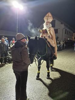 Beim traditionellen Bergwacht-Nikolaus strahlten auch in diesem Jahr wieder zahlreiche Kinderaugen, als der Heilige Nikolaus hoch zu Ross gemeinsam mit seinen Ruprechten in die von Kindern und Eltern gesäumte Von-Lingg-Straße einritt. Bevor die rund 350 goldverpackten Päckchen verteilt wurden, schlug der Nikolaus wie jedes Jahr sein großes Buch auf und richtete sowohl mahnende als auch viele lobende Worte an die Nesselwanger Kinder. Für einen stimmungsvollen Rahmen sorgte die Harmoniemusik, die die Veranstaltung musikalisch begleitete.