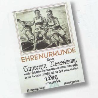 Am 09. September 1928 war es dann soweit. Das erste Vereinsabturnen, wie es damals noch hieß, fand in Oy auf der Festwiese bei der Bahnhofsrestauration statt. Die teilnehmenden Vereine Oy, Mittelberg, Petersthal, Wertach und Nesselwang trafen sich zur Aufstellung am Gasthaus Stach und marschierten im Festzug unter Begleitung der Harmoniemusik Oy zur Wettkampfstätte.