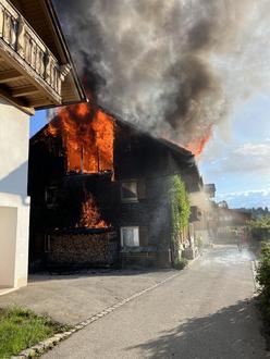 Am Sonntag, 19.05.24 um 07.04 Uhr wurde die Feuerwehr Nesselwang über einen „Brand mit Personen in Gefahr“ alarmiert. Nach Lage auf Sicht mit starker Rauchentwicklung und Flammenschein wurde die Alarmstufe entsprechend erhöht und auch die Nachbarfeuerwehren alarmiert. Der Dachstuhl hat sich bei der Ankunft der Feuerwehr bereits im Vollbrand befunden. Eine Brandausbreitung auf die angrenzenden Gebäude galt es zu verhindern.