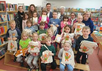 Um die Medien sicher nach Hause zu bringen, überreichte „Felix“ jedem Kind einen kleinen Bücherei-Rucksack, in den sie gleich das ausgeliehene Buch reinstecken konnten.