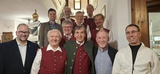 Vorne von links: bisheriger Vorstand Dietmar Bischet, Kassier Karlheinz Kaiser, neuer 1. Vorstand Micha Wipper, Ehrenvorstand Klaus Marek, Dirigent Klaus Dirr. Mitte von links: Bürgermeister Pirmin Joas, neuer 2. Vorstand Manfred Klink, neuer Schriftführer Bernhard Kiesling, Beirat Gustav Hampl, Hinten von links: Beiräte Hans-Toni Hatt und Friedbert Schuler. Es fehlt Notenwart Gebhard Demler.