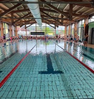 Am Mittwoch, den 28. Mai 2025, fand im ABC-Bad das alljährliche Schwimmfest der Grundschule Nesselwang statt. Über 200 Schülerinnen und Schüler traten in verschiedenen Schwimmdisziplinen gegeneinander an und bewiesen ihr Können, welches sie im vorausgegangenen Sportunterricht trainiert hatten. Beim Einzelwettbewerb schwammen die Kinder auf den 25m-langen Bahnen gegeneinander. Die Zahl der Schwimmanfänger konnte in diesem Jahr erfreulicherweise deutlich reduziert werden. Grund dafür war sicherlich auch das Sonderprogramm des bayerischen Landtages zur Verbesserung der Schwimmfähigkeit von Schülerinnen und Schülern im Grundschulalter, das die Grundschule Nesselwang in Kooperation mit der DLRG für die Schwimmanfänger angeboten hatte. Dass so viele Kinder die langen Bahnen bewältigen konnten, war ein großer Erfolg. Neben den Wettkämpfen konnten die Kinder an Stationen der DLRG auch ihre Fähigkeiten beim Rettungsschwimmen spielerisch trainieren. Schwimmen ist vielseitig und wertvoll. Das wurde den Kindern an diesem Tag bewusst. Den krönenden Abschluss bildeten wie jedes Jahr die Klassenstaffeln, bei denen die Spannung und Stimmung im Hallenbad nicht zu überbieten war.