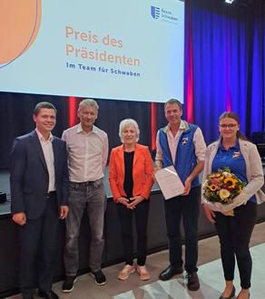 Mit dem Preis des Präsidenten „Im Team für Schwaben“ würdigt der Präsident des Bezirks Schwaben, Martin Sailer, das ehrenamtliche Engagement in den Sportvereinen vor Ort. Heuer wurde der Preis in der Kategorie Sport und Umwelt und / oder Gesundheitsschutz verliehen – so ging ein Anerkennungspreis zum Skiklub Nesselwang e. V. Am 27. September wurde der SKN zur Verleihung des Preises nach Augsburg eingeladen. Ein Teil der Vorstandschaft und Bürgermeister Pirmin Joas ist dieser gefolgt. „Sport stiftet Gemeinschaft“, so Bezirkstagspräsident Martin Seiler gleich zu Beginn. Er dankte den zahlreichen Vereinen für ihr Engagement. Nach Begrüßungen und Verleihungen an weitere Vereine ging es „nach Nesselwang“ – der Skiklub wurde mit seinem Projekt vorgestellt. Den Preis erhielt der Klub für die 2022 installierte PV-Anlage. Um nachhaltig Sport zu treiben, wurde die Anlage installiert. Im Sommer wird Strom, der nicht gebraucht wird, in die Community eingespeist und in der Winterzeit, in der mehr Strom durch die Lichtanlage usw. gebraucht wird, kann ganz einfach auf die Community zurückgegriffen werden und dadurch Strom bezogen werden.