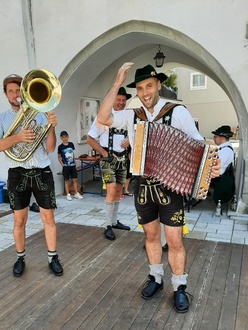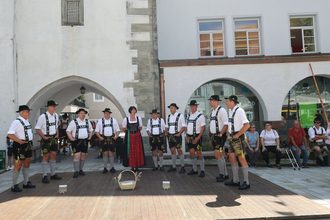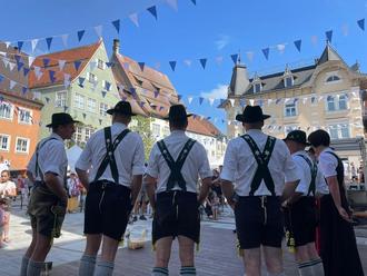 Direkt am Marktplatz in Isny wurden die flanierenden Gäste über 2 Stunden mit traditionellen Jodlern unterhalten. Das Flair der Stadt an diesem sonnigen Feiertag war für die Jodler und Gäste ein besonderes Erlebnis.