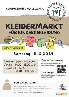 Am Samstag, den 11. Oktober 2025 findet von 14.00 bis 16.00 Uhr der Herbst-Kleidermarkt in der Alpspitzhalle Nesselwang statt. Verkauf von gut erhaltener Kinderkleidung in den Größen 50-176, Schuhe, Spielsachen, Bücher, Babysachen etc. Nur Barzahlung möglich. Mit Kuchenverkauf.