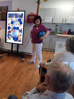 „Felix“, unser neuer interaktiver Gesundheitsspiegel, unterstützt seit ein paar Wochen unsere Alltagsbegleiter bei den spielerischen Bewegungs- und Aktivierungsangeboten. Er ist ein riesiger Bildschirm, der mit unseren Alltagsbegleitern auf Rollen durchs ganze Haus unterwegs ist und unterschiedlichste Möglichkeiten zur Freizeitgestaltung anbietet, die speziell auf unsere Bewohner abgestimmt sind. Die Damen der Alltagsbegleitung sind natürlich immer aktiv dabei und werden von „Felix“ bestens unterstützt. So gibt es auf dem Bildschirm diverse Bewegungsübungen, die von Trainern vorgeführt werden. Auch kognitive trainings- und gemeinschaftsstärkende Spiele bietet unser „Felix“ an. Vom Erraten der Bilder bei Dalli-Klick über Worterkennung in den verschiedensten Dialekten oder Karaoke singen – dabei ist viel Spaß garantiert. Unsere Bewohner sind begeistert von den vielseitigen Möglichkeiten, die sich durch den Bildschirm anbieten. Darüber hinaus kann „Felix“ mit Entspannungssequenzen (Musik/Licht/Film) bei der palliativen Begleitung behutsam eingesetzt werden und unseren bettlägerigen Bewohnern etwas Abwechslung verschaffen. So sorgt z.B. ein Sternenhimmel in Kombination mit Musik für Wohlgefühl. Das Betreuungsteam setzt unseren Felix in allen Wohnbereichen fleißig ein, damit alle Bewohner in den Genuss kommen.