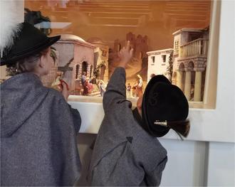 Die Renz-Kinder betrachten nach dem Gottesdienst an Erntedank in der Pfarrkirche St. Andreas in Nesselwang die Szene in der Jahreskrippe "Jesus der Kinderfreund".