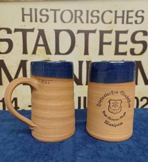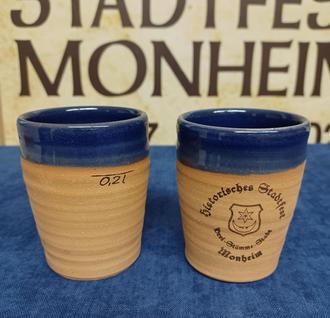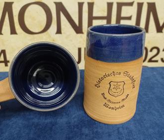 Die Stadt Monheim hat zum historischen Stadtfest neue Krüge 0,5 Liter und Becher 0,2 Liter produzieren lassen. Allesamt handgefertigte Tonkrüge mit blaulasiertem Rand und blaulasiertem Innenleben. Für 10,- EUR pro Krug und 6,- EUR pro Becher ab sofort käuflich in der Tourist-Info und am Festwochenende im Festbüro im Kreuzwirt zu erwerben!