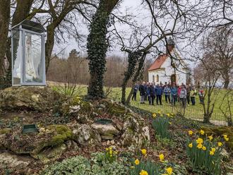 Nach der ersten Wander-Etappe wurde an der Himmelfahrtskapelle ein kleiner Stopp eingelegt und das Lied „Großer Gott wir loben dich“ gemeinsam gesungen. Weiter ging es durch Wald und Flur, vorbei am Rot- und Damwildgehege bis hinauf zum Mähhorn.