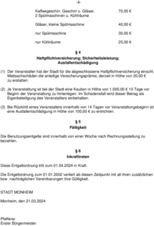 | (1) | Der Veranstalter hat der Stadt für die abgeschlossene Haftpflichtversicherung einschl. Mietsachschäden die anteilige Versicherungsprämie, derzeit in Höhe von 20,00 € zu erstatten. |