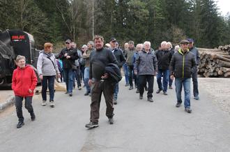 Der nächste Stopp wurde in der Nähe des heutigen Bahnhofs im ehemaligen „BayWa Gelände“, dem jetzigem Forstunternehmen Ernst Steinle gemacht. Dort gab es eine kleine Rast mit der Möglichkeit etwas zu trinken. Anschließend gab der Besitzer, Herr Steinle, Einblick in die maschinelle Brennholzaufbereitung. Es konnte verfolgt werden, wie ein fünf Meter langer Baumstamm in die Maschine gefördert wurde und am Schluss (in einem Arbeitsgang) „Holzscheite“ in 35 cm Länge aus der Maschine kamen. Herr Steinle führte alle Teilnehmer durch seinen Forstbetrieb und erläuterte die einzelnen Stationen. Alle Teilnehmer waren daran sehr interessiert und dankbar für die Vorführung.