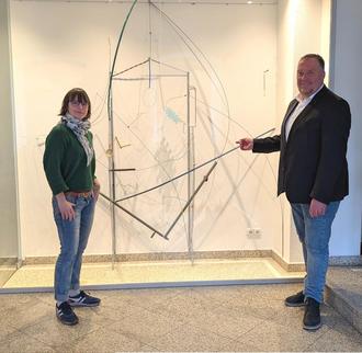 Der Aufbau in der Vitrine des Rathauses erscheint den meisten Besuchern wahrscheinlich zuerst sehr fremd oder auch nicht als fertig. Die Künstlerin Anne Römpp aus Konradsreuth interessiert es aber, Fundstücke und vor Ort gegebene Bedingungen zu nutzen. Bei genauerer Betrachtung der Installation entdeckt man zum Beispiel Büroklammern, Meterstäbe oder auch einen Teil des Stempelträgers aus dem Archiv. Ohne zu Kleben oder zu Schrauben halten sich alle Elemente gegenseitig durch Magneten oder sind im verwendeten Regalteil verspannt. Dazu sind selbst die vorhandenen Löcher in der Wand als Ankerpunkte genommen worden.