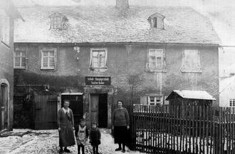 Das „Reiffenbergerhaus“Nr. 107, links im Bild ist noch das ehemalige Haus des Lehrers Holler (HN 172) zu sehen. Zum Zeitpunkt der Bildaufnahme 1924 befand sich darin die Metzgerei von Walter Voigt. Die abgebildeten Personen sind v.l Minna Schneider geb. Eckardt mit Sohn Alfred („Gemaaschreibersalfred“) und v.r. Ida Kaußler geb. Wülferth mit Tochter Lotte.