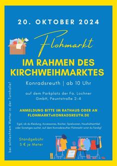 Die Standgebühr beträgt 5 Euro pro Meter. Anmeldungen sind noch bis zum 13. Oktober 2024 im Konradsreuther Rathaus oder unter flohmarkt@konradsreuth.de möglich.