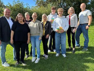 Auf dem Foto v.l.n.r.: Bürgermeister Matthias Döhla, Petra Sirsch-Neumann, Viktoria Horn, Lea Deeg, Maria Knüpfer, die Bundesfreiwilligendienstleistenden Eli und Marlon, Rektorin Marion Spörl und der Personalratsvorsitzende Viktor Deimunt.
