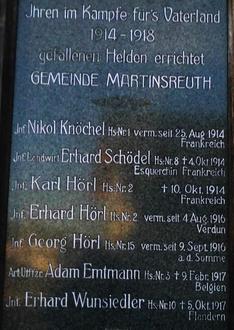 Nr.2: Der Ort Martinsreuth errichtete um die gleiche Zeit (1923) für seine Gefallenen ein eigenes Kriegerdenkmal, weil er damals noch zur Gemeinde Eppenreuth gehörte. Es mußte dem Bau des Sportheimes weichen. Die Gedenktafel mit den Namen der Kriegsopfer erhielt einen neuen Platz am Feuerwehrhaus. Allein Martinsreuth beklagte sieben Opfer.