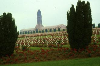 Soldatenfriedhof bei Verdun mit dem riesigen Beinhaus in Form eines alles überragenden Denkmales, in dem die Gebeine von Tausenden nicht identifizierten Gefallenen ihre letzte Ruhe fanden.