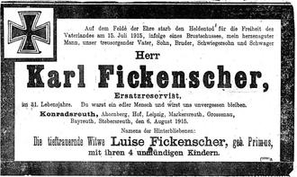 Die vorliegende Traueranzeige (im Ausschnitt erhalten geblieben – wahrscheinlich vom Hofer Anzeiger ) weist auf das Leid hin, das die Hinterbliebenen getroffen hat: Von nun an muß die zurückgelassene Witwe allein für vier kleine Kinder sorgen. Auch von dieser Familie gibt es noch Verwandte.