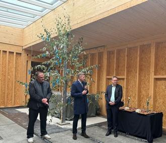 Im Beisein von Regierungspräsidenten Florian Luderschmid (rechts), Landrat Dr. Oliver Bär (Mitte), Bürgermeister Matthias Döhla, vielen Ehrengästen der planenden und ausführenden Firmen, zahlreichen Mitgliedern des Gemeinderates sowie der Schulfamilie und der evangelischen Kirchengemeinde konnte ein erster Meilenstein des neuen Kindergartens gefeiert werden. Nach Aufstellung der Wände und des Daches wurde mit den Beteiligten ein zünftiger „Hiebschmaus“, das traditionelle Richtfest, gefeiert.