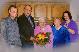 Auf dem Bild v. l. n. r.: Philipp Leitenberger (Ehemann der Enkeltochter), 2. Bgm. Theodor Gemeinhardt, die Jubilarin Waltraud Adam, Tochter Ilona Ackermann und Enkelin Tanja Leitenberger.