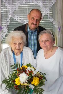 Auf dem Bild v. l. n. r.: Die Jubilarin Waltraud Adam, Zweiter Bürgermeister Theodor Gemeinhardt und Tochter Ilona Ackermann.