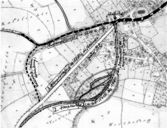 Mit Beginn der Neuzeit (um 1500) verschoben sich auch die Wirtschafts- und Handelszentren in Deutschland. Nürnberg und Leipzig waren jetzt die Schwerpunkte. Der Güterhandelsverkehr verlagerte sich auf diese Strecke und führte wiederum durch Konradsreuth, dann aber weiter über Münchberg, Gefrees, Bayreuth. So knickte die neue Hauptstraße mitten in unserem Ort (beim „scharfen Eck“) links – also mehr südwärts – ab, um zunächst die starke Steigung zu überwinden. Da es niemand gab, der für Straßenunterhalt zuständig war, suchte jeder Wagenlenker die günstigste Spur für sich. So entstand im Bereich der ärgsten Steigung eine sogenannte „Straßenspindel“ (s. kreisförmig markierte Stelle im Plan!), wie wir es von anderen Altstraßen her kennen; das heißt der Fahrweg teilt sich in mehrere Spuren, die sich weiter oben wieder zu einer vereinigen. Der „Kutscher“ sucht sich die günstigste aus. So rollte der Hauptverkehr etwa ab 1500 auf der neuen Linie, der „Bayreuther“ oder auch „Nürnberger“ Straße, wie sie verschiedentlich genannt wurde. Erst der 30jährige Krieg unterbrach die begonnene Verkehrsentwicklung. Das Straßenwesen war danach in einem unerträglichen Zustand, die Anforderungen des Fahrverkehrs wurden immer dringlicher: 1683 gab es die erste regelmäßige Postverbindung zwischen Nürnberg und Leipzig, 1686 wurde eine „geschwinde Postkutsche“ auf dieser Strecke eingeführt. Der Markgraf als zuständiger Landesherr befahl schließlich den Ausbau der Strecke in unserem Gebiet zu einer „Chaussee“ mit Fahrbahn und schattenspendenden Randbäumen. Die Straße zwischen Konradsreuth und Münchberg wurde etwa ab 1750 ausgebaut, bei der Rothenmühle und wohl auch bei der Kohlstatt (Waldlust) wurden die Furten durch den Ulrichsbach und die Untreu durch steinerne Brücken ersetzt (1782, nach Dietel). Um diese Zeit entstand auch die neue „Münchberger Straße“ durch bisher unbefahrenes Gelände zwischen den alten Ortsstraßen, die durch großzügige Breite und Geradlinigkeit hervorstach (vgl.Abbildung). Die „alte Bayreuther Straße“ wurde zur Weberstraße, ihre stillgelegten Verzweigungen wurden von den Anliegern als Zufahrt verwendet oder lagen plötzlich als Ödland brach. So ist aus Lehensbriefen und dem Steuerkataster von 1811 belegt (Chronik Hofner), daß der damalige Grundherr von Reitzenstein im Jahr 1789 für sieben Gulden aus dem stillgelegten Straßengrund einen Bauplatz an den Weber Peter Morgner für ein Trüpfhäuslein samt kleinem Hof und Schorgarten verkaufte. Es handelt sich um das Haus Nr. 43, heute Waldlustweg 2 (ehemals Heinzmann Babette). Schon damals war ein Bauplatz für 7 Gulden ein Schnäppchen.