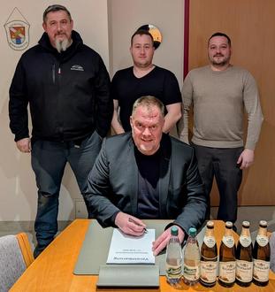 Zu den jüngsten Vertragsgesprächen trafen sich die Hofer-Land Festwirte (v.l.) Markus Richter und Dominik Roth gemeinsam mit Kämmerer Bastian Schreiner und Bürgermeister Matthias Döhla im Rathaus, um die letzten Details zu besprechen.