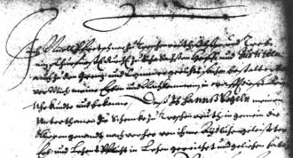 Der Anfang des Lehensbriefes von 1667, den der damalige Grundherr des Gutsdorfes Troschenreuth, Nikol Pfretschner, kurfürstlich sächsischer Hof- und Justizrat in Grenz- und Justizsachen an seinen Untertanen, den Wirt Hans Vogel ausgefertigt hat (Quelle:Sächsisches Staatsarchiv Dresden, Bestand 12613)
