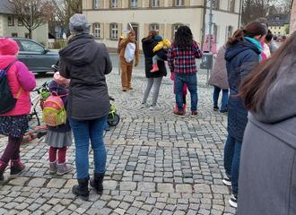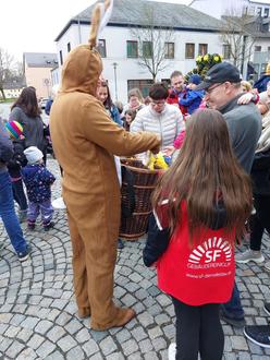 Anschließend verweilte der Osterhase noch auf dem Marktplatz und stellte sich auf Wunsch noch mit den Kindern für ein Erinnerungsfoto am Brunnen auf.