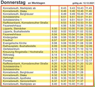 Viele nutzen ihn bereits, manche wissen es vielleicht gar nicht: Der Leupoldsgrüner Bürgerbus darf selbstverständlich auch von Konradsreuthern benutzt werden. Immer donnerstags fährt der Bürgerbus auch Konradsreuth an. Die Haltestellen sind „Berghäuser“, „Diska“, „Apotheke“, „Seniorenheim“ und „Marktplatz“. Wenn man es geschickt anstellt, kann man mit dem Bus z.B. um 8:43 Uhr vom Marktplatz zur diska fahren und um 9:32 Uhr wieder zurück. Und dies insgesamt vier Mal im Stundentakt.
