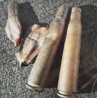 Plattgedrückte Geschoße und Patronenhülsen vom damaligen Tieffliegerangriff (Repro-Aufn. Mathilda K.)