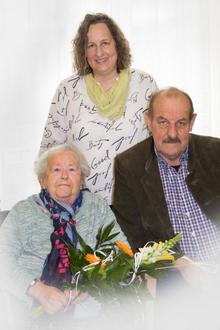 Auf dem Bild v.l.n.r.: Die Jubilarin, Pfarrerin Elfriede Schneider und Zweiter Bürgermeister Theodor Gemeinhardt.