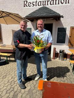 Zur Eröffnung des Biergartens überbrachte Bürgermeister Matthias Döhla ein kleines Geschenk der Gemeinde und wünschte für die Saison guten Erfolg.