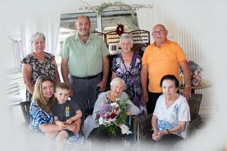 Auf dem Foto hinten von links nach rechts: Schwiegertochter Ingrid Höra, 3. Bgm. Wolfram Eckardt, Tochter Angelika Schulze, Sohn Wolfgang Höra. Vorn von links nach rechts: Enkelin Nadine Goppold mit Urenkel Max, die Jubilarin Maria Höra und Schwester Brigitte Streibelt.