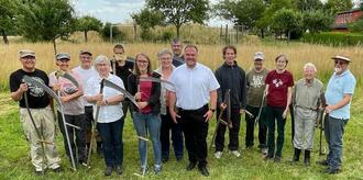 Regen Zuspruch fand der von der Ortsgruppe Frankenwald Ost des BUND Naturschutz in Bayern e.V. angebotene Sensen- und Dengelkurs. Unter fachkundiger Anleitung lebt diese alte Handwerkstradition wieder auf. Einige Teilnehmerinnen und Teilnehmer hatten sogar ihre eigenen Gerätschaften dabei. Die Handhabung der Sensen, Wetzsteine, Dengelhämmer und -blöcke wurde in einem dreieinhalb Stunden dauernden Kurs am Pfarrholz in Konradsreuth erlernt. Bürgermeister Matthias Döhla stattete dem Kurs einen kurzen Besuch ab und freute sich, dass sich so viele Interessenten an einem Samstagvormittag eingefunden hatten.