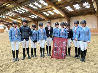 Teamgeist wird bei der PSG Eichelshof großgeschrieben. So machten sich am 5. März 2023 wieder 2 Teams mit vielen Helfern und Fans auf den Weg nach Oberursel zum Kombinierten Mannschaftswettkampf Hessen-Nassau, der zugleich die Qualifikation zur Nationalen Dressurprüfung Kl. A Kür für Mannschaften beim Internationalen Festhallenreitturnier in der Frankfurter Festhalle ist. Im Dezember 2022 konnte ein Team der PSG Eichelshof Bad König hier einen tollen 3. Platz belegen. Team 1 bestand aus Paula Petri mit Lake Diamond, Jule Schütz mit Dialordano, Amelie Schütz mit Karla, Johanna Mönch mit Knockillaree Blue Lady und Mannschaftsführerin Marlene Scheffler. Team 2 setzte sich aus Alea Wohlgemuth mit Palmerstown Paul, Nina Weißenbacher mit Floresco P, Liv Schwinn mit Clearville Beauty, Laura Helmstätter mit Shirkan, Justin Wohlgemuth mit Hadera (nur Springen) und Mannschaftsführerin Miriam Fröhlich zusammen. Für die Mannschaftswertung müssen jeweils 4 Reiter eine Mannschaftsdressur und einen Springparcours auf A*-Niveau bestreiten. Trainiert und betreut wurden beide Teams von Annette Wohlgemuth. Am Ende eines langen, aber schönen Tages stand dann leider fest, dass es in diesem Jahr nicht für ein Ticket für das Internationale Festhallenreitturnier in Frankfurt reichte. Aber es wird im nächsten Jahr sicher wieder mindestens ein Team geben, dass an dem Kombinierten Mannschaftswettkampf Hessen-Nassau teilnehmen wird. Wir freuen uns schon jetzt auf die Vorbereitungen und den Wettkampf in 2024, der den Teamgeist im Verein enorm fördert.