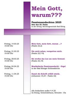 „Mein Gott, mein Gott, warum hast du mich verlassen?“ So beginnt der Psalm 22. Jesus hat diesen Satz laut hinausgeschrien, als er am Kreuz hing. Die Passionsandachten in der Evang. Kirchengemeinde Bad König greifen in diesem Jahr den Psalm 22 auf. Unter dem Titel „Mein Gott, warum?“ finden die Andachten an folgenden Freitagen um 19 Uhr im Gemeindehaus statt: 14.3.; 21.3.; 28.3.; 11.4.25. Am 4.4. findet die Andacht in Form einer Orgelmusik in der Kirche statt. Herzliche Einladung!