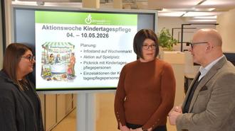 Kindertagespflege im Fokus: Landrat Frank Matiaske tauscht sich bei einem Besuch im Jugendamt mit dessen Leiterin Karina Glabisch und der zuständigen Mitarbeiterin Lisa Berg (links) über aktuelle Themen der Kindertagespflege und die Vorbereitungen für die Aktionswoche Anfang Mai aus.