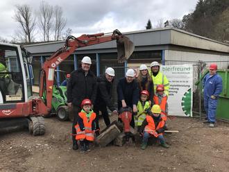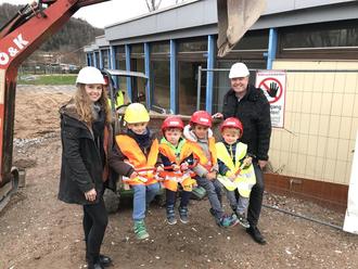 Die Freude steht nicht nur den Kita-Kindern der Kita-Fabula im Stadtteil Zell im Gesicht: Auch (von links) Kita-Leiter Kim Reipöhler, Architekt Peter Arras, Bürgermeister Axel Muhn, Erzieherin Celine Kern und der Bauleiter der Fa. Bierfreund, die mit den Abbrucharbeiten beauftragt wurde, freuen sich, dass mit dem Beginn der Abbrucharbeiten endlich Platz für den Neubau der dann 4-gruppigen Kita Fabula im Stadtteil Zell gemacht wird. Baubeginn für den Neubau der Kita am gleichen Ort ist für Mitte August geplant.