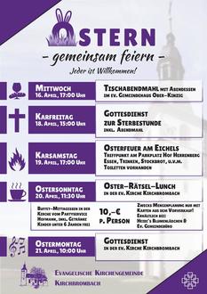 An Karsamstag findet das allseits beliebte Osterfeuer auf dem Eichels statt. Ostersonntag und Ostermontag stehen ganz im Zeichen der Osterfreude. Gemeinschaft und Essen und Trinken gehören zur Freude dazu. Deshalb wird wieder ein schmackhaftes Rätsel-Oster-Lunch angeboten. Ein Ostergottesdienst rundet die diesjährigen Feierlichkeiten ab.