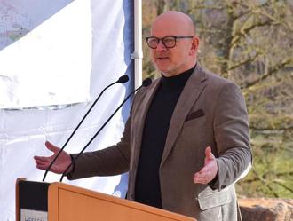 Dankt allen Beteiligten für ihr Engagement: Landrat Frank Matiaske spricht anlässlich des Ortstermins, bei dem auch Baupläne erläutert wurden.